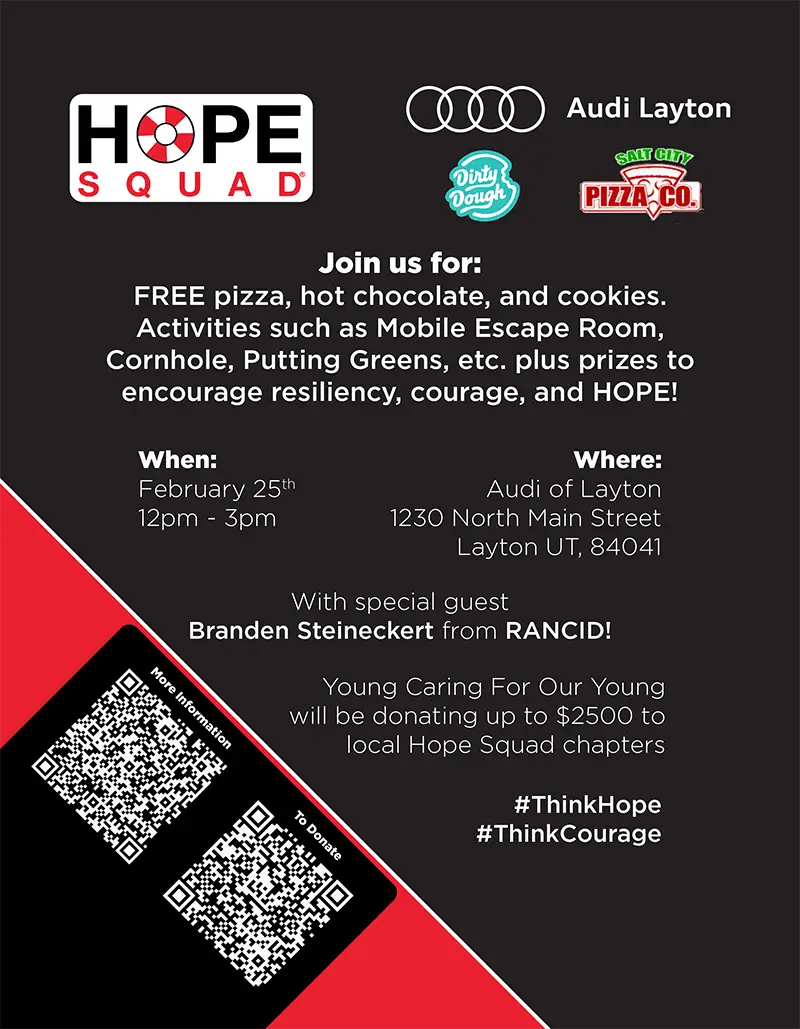Prevent Suicide with Audi Layton and Hope Squad More information coming soon.. + Add to Google Calendar + iCal / Outlook export The event is finished. Date Apr 24 2024 Expired! Time 6:00 pm - 8:30 pm Location Audi Layton Category Fundraiser Events Organizer Tami Olsen Phone (801) 513-1917 Email thinkcaring@youngcaring.org Share this event