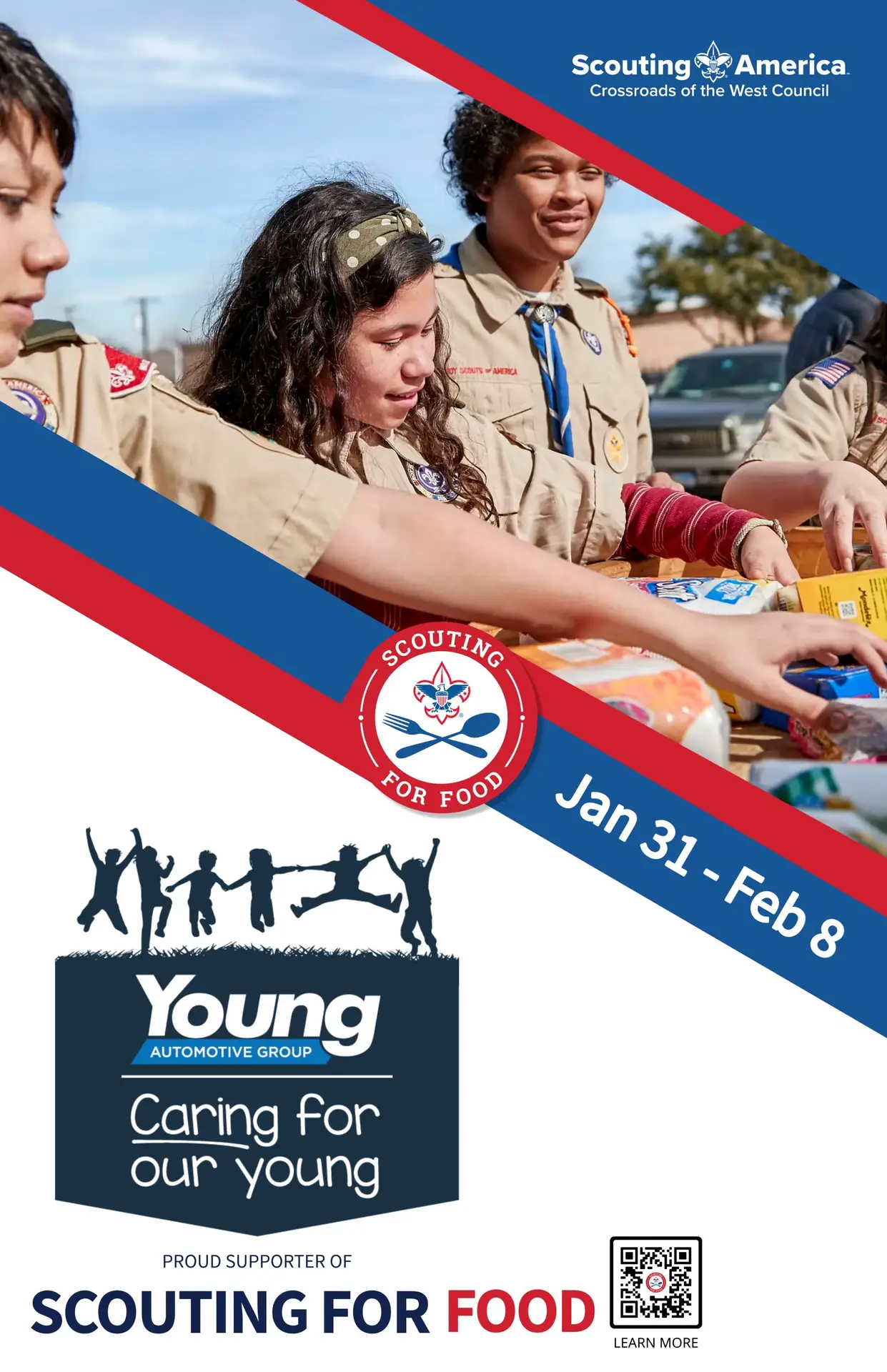 Young Caring For Our Young is a proud sponsor of Scouting for Food, an annual food drive led by Scouting America’s Crossroads of the West Council. From January 31 to February 8, all Young Automotive Group dealerships and locations will serve as drop-off points for non-perishable food donations.